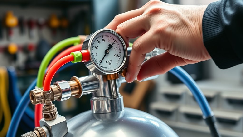 You should use precision tools like digital gauges to fine-tune pressure settings accurately. Digital gauges provide precise readings, making it easier to adjust pressure quickly and correctly. Additionally, calibration tools can help guarantee your pressure regulator stays accurate over time. Regularly using these tools allows you to maintain consistent coating quality, avoid over-application, and ensure your equipment functions at its best. Always choose reliable, high-quality instruments for best results.