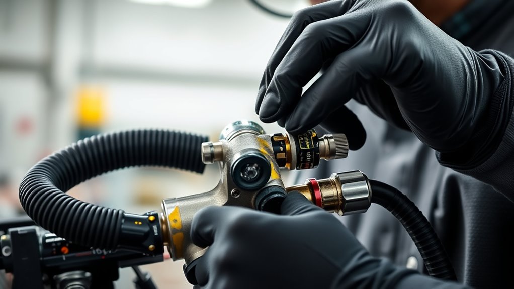 Once the main components are cleaned, focus on troubleshooting techniques to identify potential issues before they escalate. Check the spray tip for any clogs or paint buildup—if it’s blocked, clear it carefully with a small brush or tip cleaner. Inspect the filters and screens, cleaning them thoroughly to prevent future blockages and maintain consistent spray patterns. Regular maintenance tips include lubricating moving parts, tightening fittings, and inspecting seals for wear and tear. Doing this after every cleaning session keeps your sprayer running smoothly and helps you catch problems early. Additionally, understanding the importance of color accuracy can help you diagnose issues related to paint delivery and spray consistency.