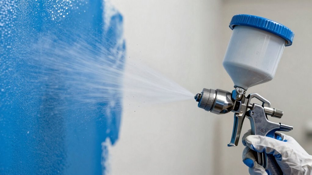 Think of your paint like a symphony needing different instruments for harmony. For latex, use smooth brush techniques and guarantee proper paint mixing to avoid splattering. Oil-based paints require thinner consistency and gentle strokes, while specialty paints like lacquers demand precise spray techniques. Adjust your pressure and nozzle accordingly, and always clean your gun thoroughly between different paint types—this keeps the flow steady and your finish flawless.