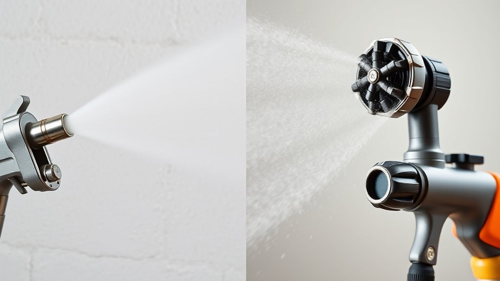 If you’re choosing between airless and air-assisted sprayers, consider your project’s needs. Airless sprayers cover large areas quickly and are great for exterior siding or fences, but can produce overspray and waste paint. Air-assisted sprayers provide a finer, controlled finish ideal for detailed work like cabinetry or trim, though they are slower and more complex. To find out which suits your project best, explore the key differences and benefits further.