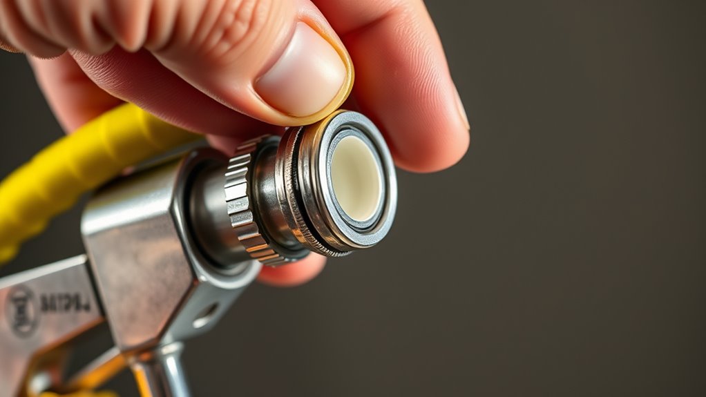 Imagine selecting the right brush for a delicate watercolor or bold oil—your hose connection needs similar care. Different paint types, like latex or oil-based, demand specific nozzle selection and proper connection techniques to prevent leaks. Consider paint compatibility; using incompatible tools can cause drips or sprays. Adjust your connection method accordingly, ensuring the nozzle matches the paint’s viscosity and properties, so your application stays smooth and leak-free.