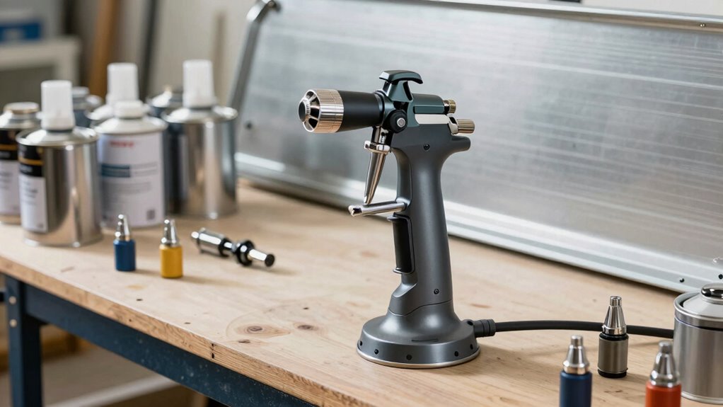 Choosing the right airless paint sprayer depends heavily on its pressure capacity, especially when applying metal primer. A minimum of 3,000 PSI is vital for effective application, guaranteeing proper atomization and coverage. Higher pressure ratings, like 3,600 PSI, improve penetration on rough or porous surfaces, leading to a more even finish. An adjustable pressure feature offers added control, helping tailor the spray to different primer types and project needs. For thicker or more viscous primers, a sprayer with a higher maximum PSI prevents clogging and guarantees consistent flow. Matching the sprayer’s pressure capacity with the manufacturer’s recommended settings is essential for maximum coverage and a smooth finish. Ultimately, selecting a sprayer with adequate pressure capacity makes your project more efficient and professional-looking.