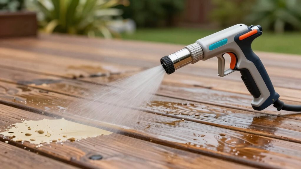 Ever felt like your spray pattern is playing hide and seek? To fix it, I check for clogged or worn-out spray tips and clean or replace them. I also make certain the pressure settings are correct, and I clear any debris in the hose. Sometimes, a simple flush or adjusting the spray angle does the trick. Regular maintenance keeps my sprayer performing smoothly and my decks looking flawless.