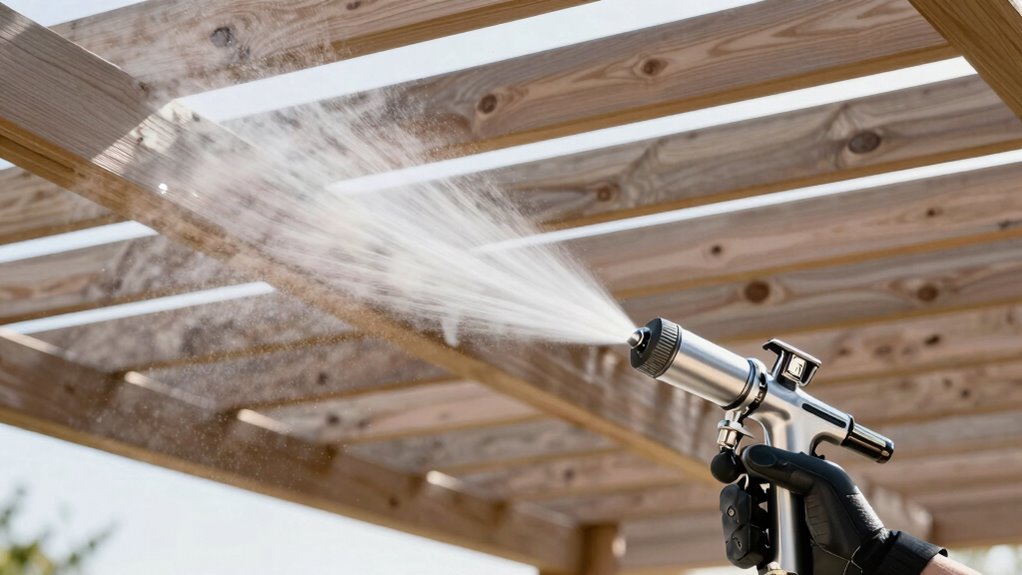 After painting pergolas, I always clean my sprayer thoroughly. I disconnect the spray tip, flush it with water or solvent, and wipe down the exterior. I also check for paint buildup, especially in filters and hoses, to prevent clogs. Storing the equipment in a dry, protected area keeps it in good shape for the next project. Regular maintenance guarantees my sprayer stays efficient and lasts longer.