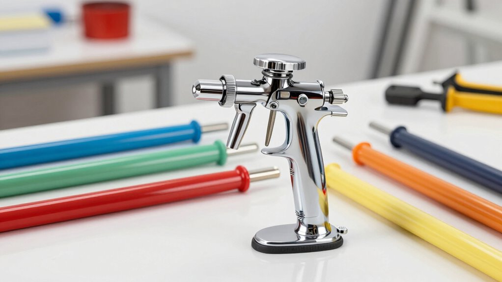 Nozzle versatility is essential because it allows you to customize spray patterns and sizes to match different spindle shapes and surface textures. A smaller nozzle, like 0.8mm, offers finer control for detailed work, guaranteeing smooth, precise coatings on intricate spindle features. Larger nozzles, such as 2.0mm or 2.5mm, enable faster coverage on broader or less detailed areas, saving time without sacrificing quality. Reversible spray tips are a great feature, making cleaning quick and preventing clogs during complex projects. Compatibility with multiple nozzle sizes increases adaptability, allowing you to handle various coating viscosities and finish requirements. Overall, having versatile nozzle options assures you can efficiently and accurately spray spindles with different shapes and finishes, making your work more professional and efficient.