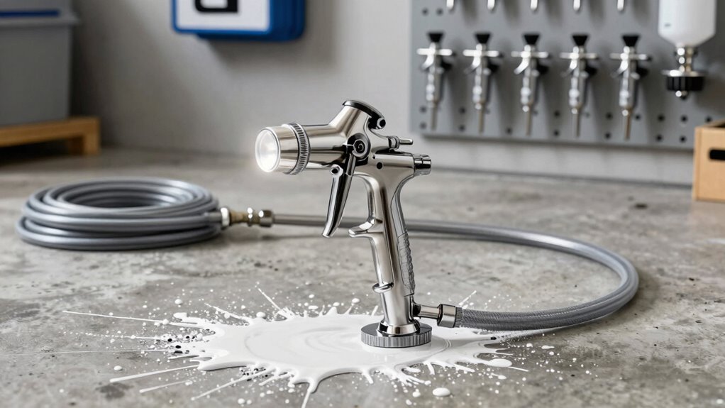 Selecting the right airless paint sprayer for thick elastomeric coatings hinges on power and pressure capabilities that match the material’s viscosity. For thick, high-viscosity paints, a minimum pressure of 3000 PSI is essential to guarantee proper atomization without thinning. Higher pressure levels help break down viscous materials, resulting in a smooth, even application on textured surfaces. An adjustable pressure control is also crucial, allowing me to fine-tune settings to prevent over-application or waste. Additionally, a motor of at least 0.8 horsepower provides the necessary power to maintain consistent pressure when spraying thick coatings. A high flow rate, say 0.3 GPM or more, assures efficient coverage without thinning, making the spraying process more effective and less labor-intensive.