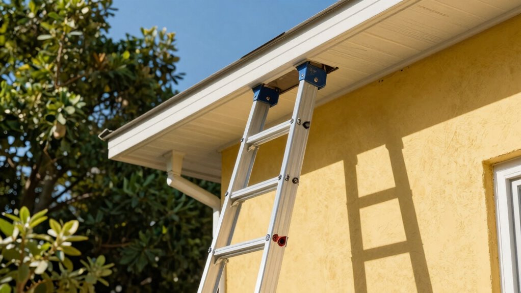 Think of your ladder as a sturdy tree reaching toward the sky. To prevent slippage, I always make sure the feet are firmly planted on a level, non-slip surface. I also extend the ladder fully and lock the rungs securely. Using ladder stabilizers or anti-slip feet adds extra grip. When I follow these steps, I feel confident climbing, knowing I’m safe and secure during my exterior painting projects.