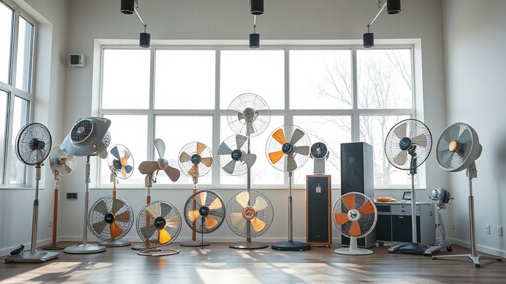 Ensuring the safety of your indoor painting environment means paying close attention to a fan’s safety certifications. Look for fans with labels like ETL, UL, or CETL, as these confirm the product meets strict electrical safety standards. Certified fans have been tested for fire hazards, electrical safety, and operational reliability, making them a safer choice. These certifications often indicate built-in safety features such as overheat protection, circuit breakers, and grounded plugs, which help prevent electrical accidents. Choosing a fan with proper safety certification reduces the risk of shocks or fires during the drying process. Always verify the presence of certification labels before purchasing or using a fan for indoor paint drying to ensure you’re selecting a reliable, safe device.