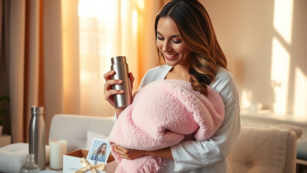Choosing gifts that are practical and useful shows thoughtfulness and can make a real difference in a new mom’s daily life. Items that serve a functional purpose, like self-care products or practical home essentials, are especially appreciated because they meet her immediate needs. Daily-used items, such as personalized mugs or versatile accessories, encourage regular use and serve as constant reminders of support. It’s important to select gifts that fit her lifestyle and are easy to incorporate into her routine without adding hassle. Consider items that address common postpartum challenges—like comfort or organization—to offer real relief. Durability, ease of cleaning, and multi-purpose features are key—they guarantee the gift remains valuable and useful long-term, helping her navigate her busy new chapter with greater ease.