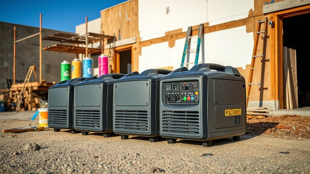 If you’re looking for the top inverter generators for painting contractors in 2026, I recommend models that combine reliable power, portability, and fuel flexibility. Units like Champion’s 4000W dual fuel and Westinghouse’s 8200W tri-fuel offer robust performance and extended runtime. Quiet operation and safety features like CO sensors are essential too. Keep exploring, and you’ll discover detailed insights on each model to help you choose the best one for your needs.