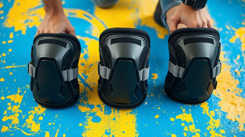 To choose the right size for painters’ knee pads, I always measure my knee circumference at the thickest point. I look for pads with adjustable straps to guarantee a snug, comfortable fit. It’s important they’re neither too tight nor too loose, so I can move freely without slipping. Trying on different sizes or reading sizing guides helps me find the perfect fit, keeping me comfortable and protected during my work.