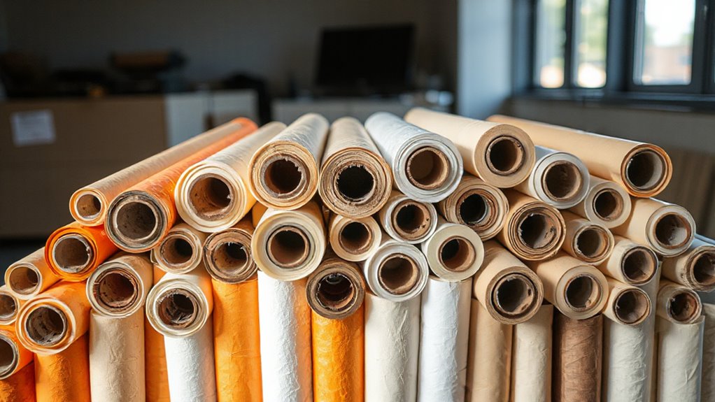 Think of storing masking paper rolls like safeguarding a treasure. I keep mine in a cool, dry place, preferably on sturdy shelves to prevent crushing. I also cover them with a breathable tarp or plastic sheeting to shield from dust and moisture. Keeping rolls upright avoids distortion, ensuring they’re ready when I need them. Proper storage extends their life, making my painting projects smoother and more efficient.