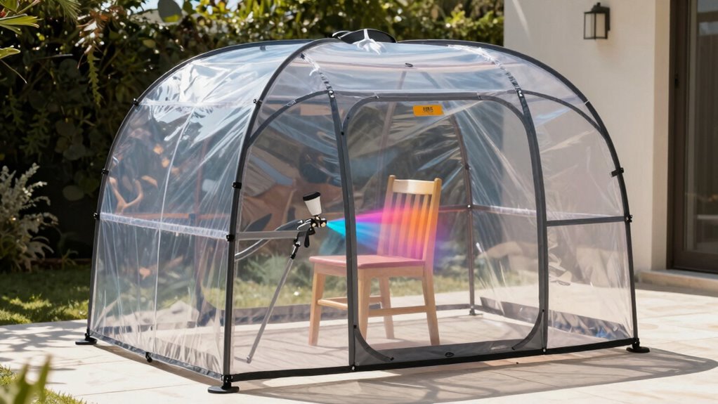 Controlling dust and overspray is essential for achieving a professional furniture finish, and the right portable spray shelter makes this much easier. Enclosed designs with mesh or fabric barriers trap particles and prevent contamination, ensuring a clean workspace. Mesh curtains at the front or vents help catch dust and insects while allowing airflow, which is crucial for proper drying. A built-in floor prevents overspray from spreading outside, keeping your area tidy and reducing airborne dust. Sealing around openings and secure attachment points also minimize dust infiltration and overspray escape during painting. Ventilation features like rear vents or mesh walls promote airflow, which helps reduce dust buildup and manage overspray effectively. These factors are key to achieving a smooth, high-quality finish on your furniture.