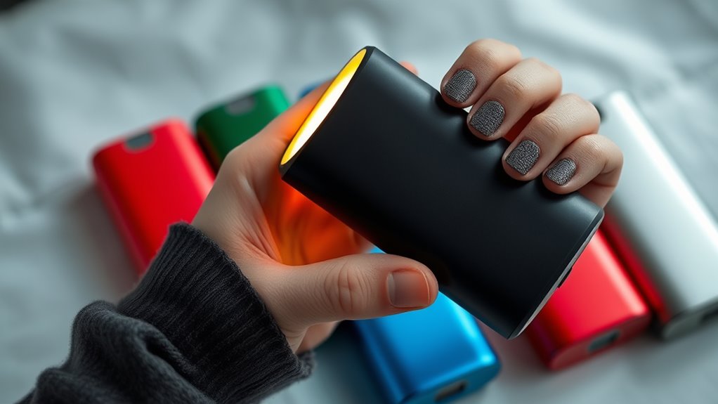 Choosing the right rechargeable hand warmer depends heavily on its battery capacity and expected runtime. A higher capacity, measured in milliampere-hours (mAh), typically means longer use between charges. For all-day outdoor warmth, I recommend at least 4000mAh to guarantee reliable heat throughout extended activities. Runtime varies with heat settings; lower temperatures usually last longer, conserving battery life. Some models can provide up to 20 hours of warmth on a single charge, making them ideal for prolonged use. Selecting a device with an appropriate battery capacity helps maintain consistent warmth without frequent recharging. This is especially important if you’re spending hours outside, where staying warm is a priority. Balancing capacity and runtime ensures you won’t be caught cold or needing to recharge too often during your adventures.