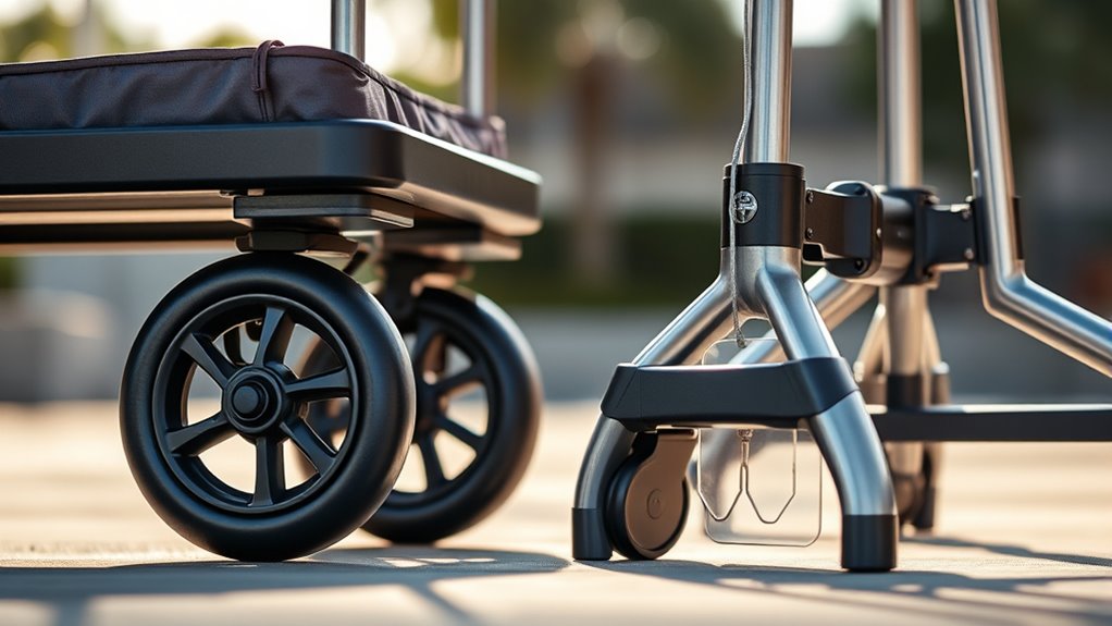 Carts are designed for portability, equipped with wheels that let you easily move them around, even in tight or uneven spaces, making them ideal for tasks that require frequent transport. Stand frames, on the other hand, prioritize stability, offering a secure base for displays or equipment but lack mobility features like wheels. Choosing between them depends on whether you need quick, flexible movement or a steady, secure setup—continue exploring these differences to find the best fit for your needs.