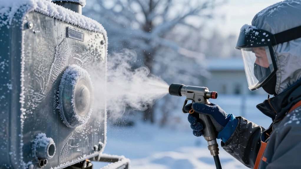 By following these cold weather spraying tips, you can prevent freezing and guarantee your project’s success. Proper preparation and awareness are key to avoiding costly failures. Isn’t it worth taking those extra precautions to protect your work and save time? Remember, when temperatures drop, staying proactive makes all the difference. Don’t let cold weather catch you off guard—plan ahead, and keep your spraying smooth and reliable, no matter how chilly it gets.