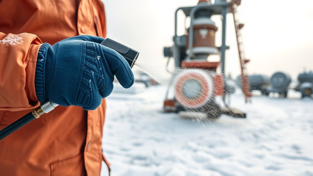 To prevent freezing and hazards during cold-weather spraying, you should regularly inspect and maintain your equipment, ensuring hoses, nozzles, and tanks are free of cracks and leaks. Use antifreeze or cold-weather additives, and store equipment in heated areas when idle. Wear proper safety gear, plan operations during warmer parts of the day, and follow safety protocols. Continuing next will provide you with essential tips to keep your spraying effective and safe in winter.
