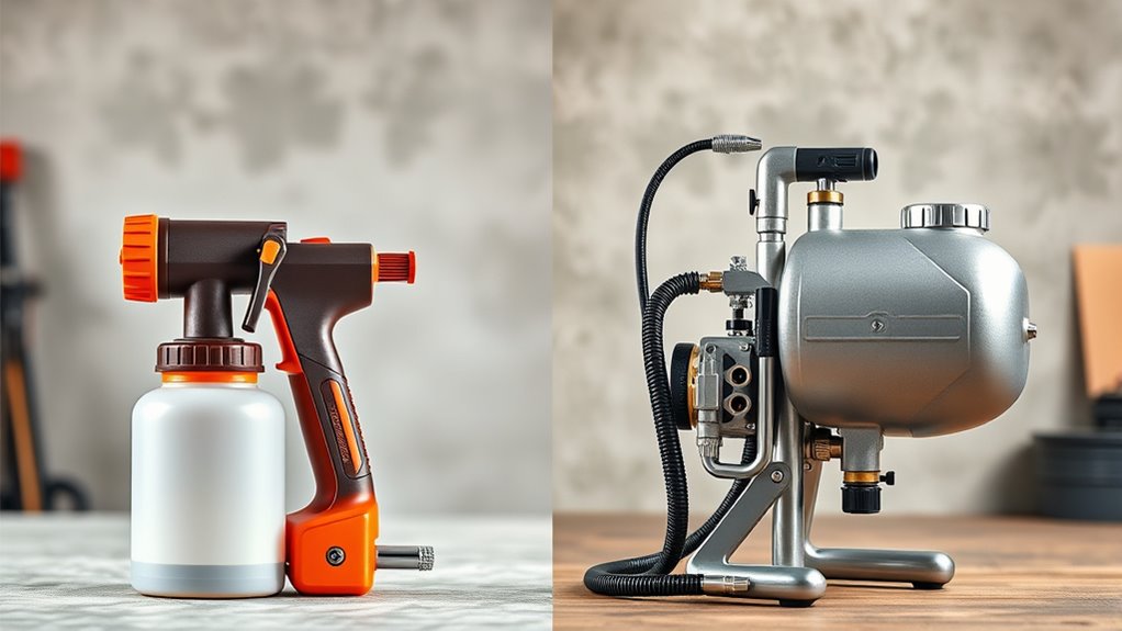 Consumer sprayers typically can’t handle industrial-grade paints because their paint quality and sprayer durability aren’t designed for such heavy-duty materials. Using thick, high-viscosity paints can clog or damage your sprayer, reducing its lifespan. To guarantee proper application and avoid damage, stick to paints recommended by the manufacturer. For industrial-grade paints, consider professional sprayers built to withstand tougher paints and extended use.