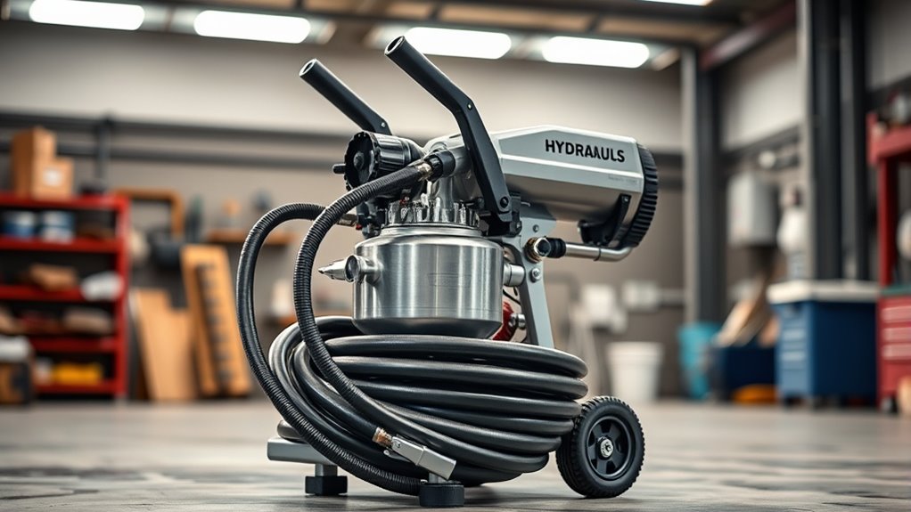 Hydraulic drive airless systems are built to handle all-day production with ease. They provide steady pressure and smooth paint flow, reducing fluctuations and touch-ups. These systems are reliable and require less maintenance, so you spend less time on repairs. Plus, they operate quietly and consume less energy, making them perfect for extended jobs. If you want to discover how these advantages can boost your projects, there’s more to explore ahead.