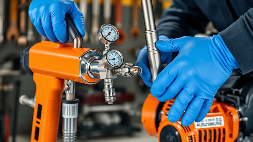 Maintaining electric airless sprayers is simpler since they have fewer moving parts and don’t require oil changes or spark plug replacements. You mainly need to keep the motor clean and check electrical connections regularly. Gas models demand more upkeep, including oil changes, replacing spark plugs, and cleaning fuel filters. They also have more engine components that need inspection over time. If you want to see detailed maintenance tips for each, continue exploring further.