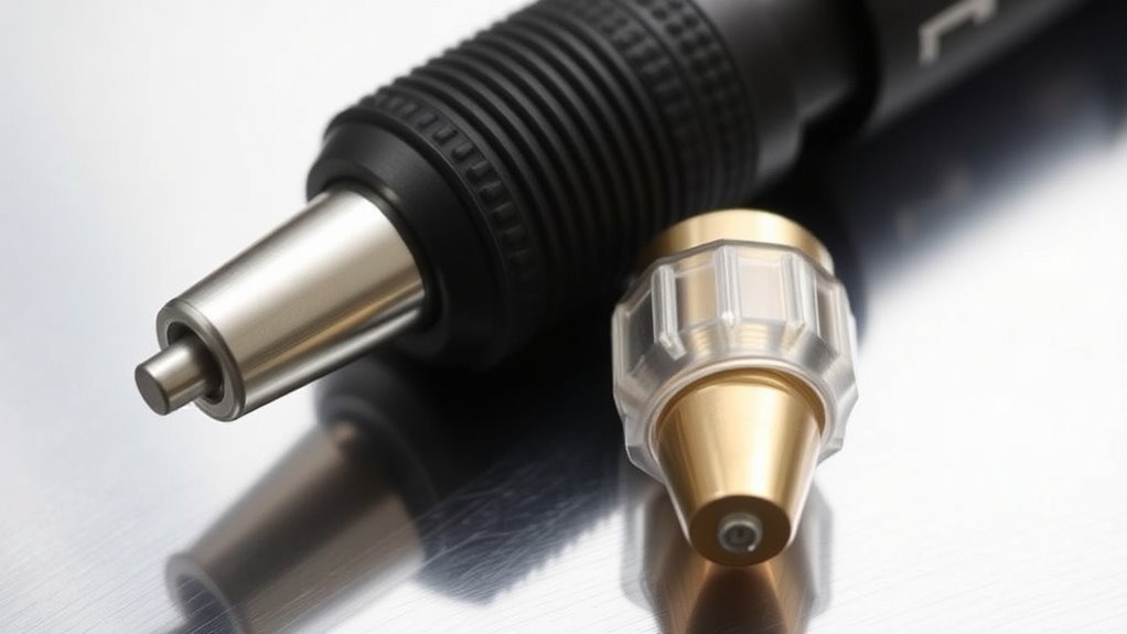 Sure, because using a plastic nozzle on a fiery weld sounds brilliant, right? Material compatibility is key—choose application-specific materials to avoid disasters. For high heat, go for metals like stainless steel; for delicate finishes, softer materials like rubber or plastic work well. Ignoring this is like wearing flip-flops in a snowstorm. Match your materials to your application, and you’ll keep safety and efficiency intact—no surprises, just smooth operation.