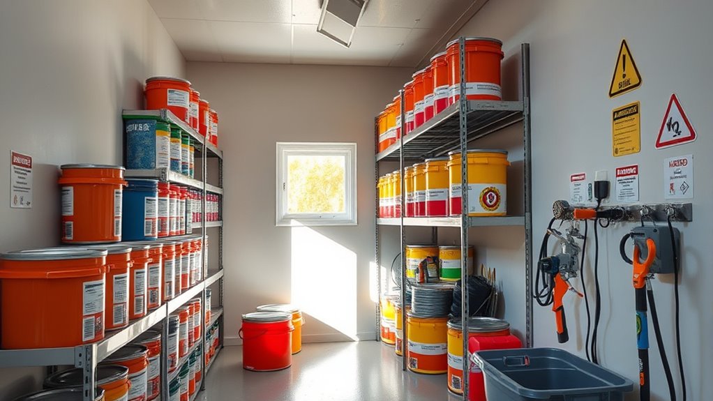 Properly storing paint and equipment is essential for safety and maintaining their quality. When you’re organizing your supplies, paying attention to ventilation considerations is crucial. Paint fumes can be hazardous, especially in enclosed spaces, so you should ensure the storage area is well-ventilated. Good airflow helps disperse volatile organic compounds (VOCs) and reduces the risk of fumes building up to dangerous levels. If possible, store paints in a room with windows or exhaust fans, or in a space with a dedicated ventilation system. Avoid storing paint in basements or small closets that lack proper airflow. This not only improves safety but also helps prevent the buildup of fumes that could cause health issues or even fire hazards.