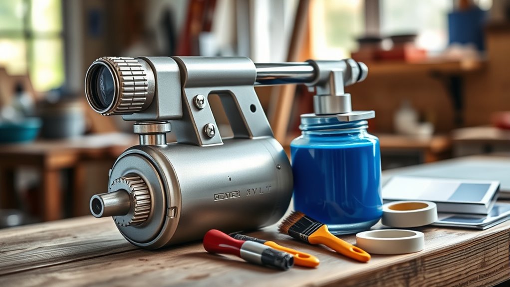 For small projects, you need a simple maintenance routine. After each use, clean your sprayer thoroughly to prevent clogs, using the recommended cleaning solution. Store it in a dry, cool place, and cover it to keep dust out. Regularly check hoses and filters for wear or damage. Proper cleaning and storage tips guarantee your sprayer stays in good condition, ready for your next project and extending its lifespan.