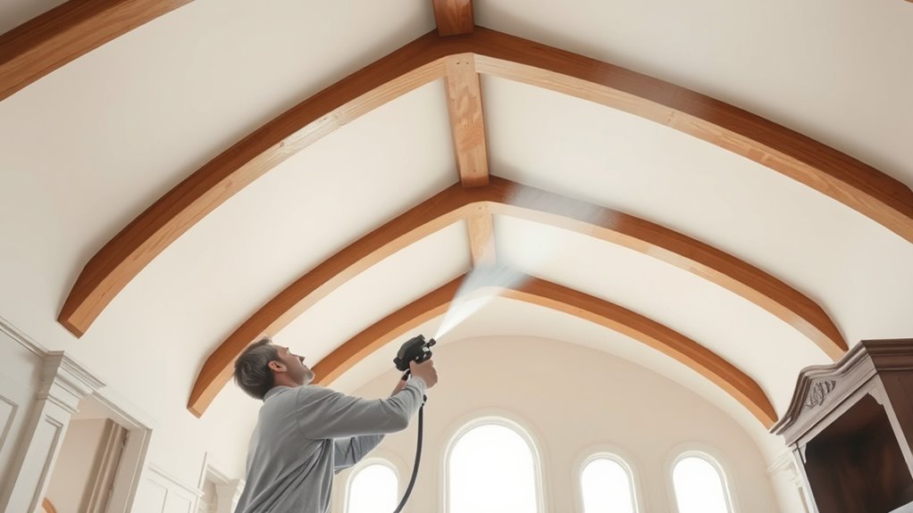 Spraying ceilings in vaulted rooms might seem intimidating, but with the right technique, it becomes a manageable task. Think of it as painting a sky—steady hands and patience help you craft a seamless, beautiful finish. Don’t rush; your careful approach will turn a challenging ceiling into a stunning centerpiece. Remember, with each brushstroke, you’re transforming a blank canvas into a masterpiece—your vaulted ceiling will be the crown jewel of your space.
