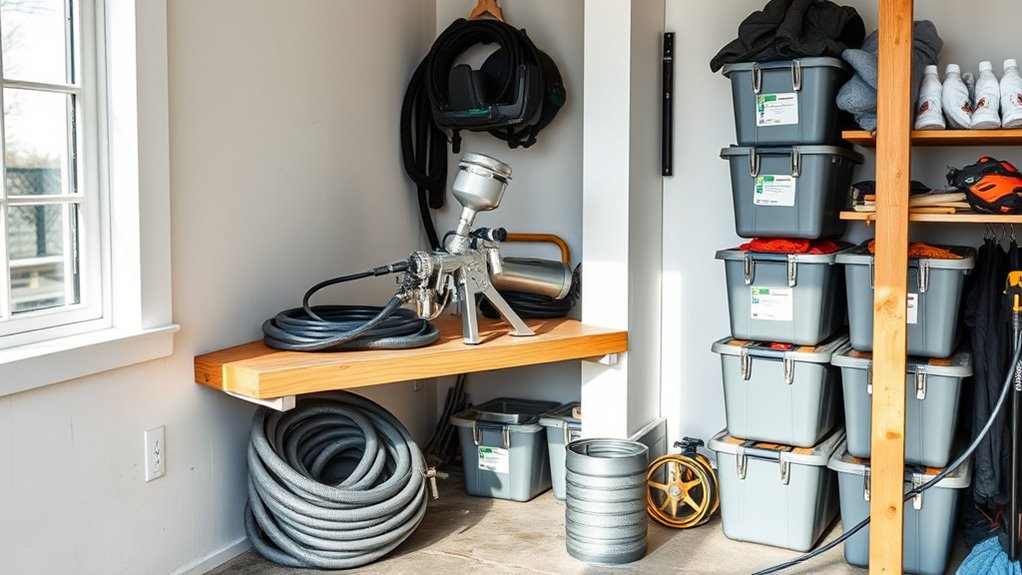To store your airless sprayer for winter, first disconnect it from power and flush out any remaining paint or cleaning solutions to prevent hardening. Drain water from hoses, apply antifreeze if needed, and thoroughly clean all components. Store it in a dry, frost-free location and cover it to protect from dust. Lubricate moving parts and inspect for damage. Following these steps helps prevent freezing and corrosion—if you want to learn more about proper winter storage, keep going.